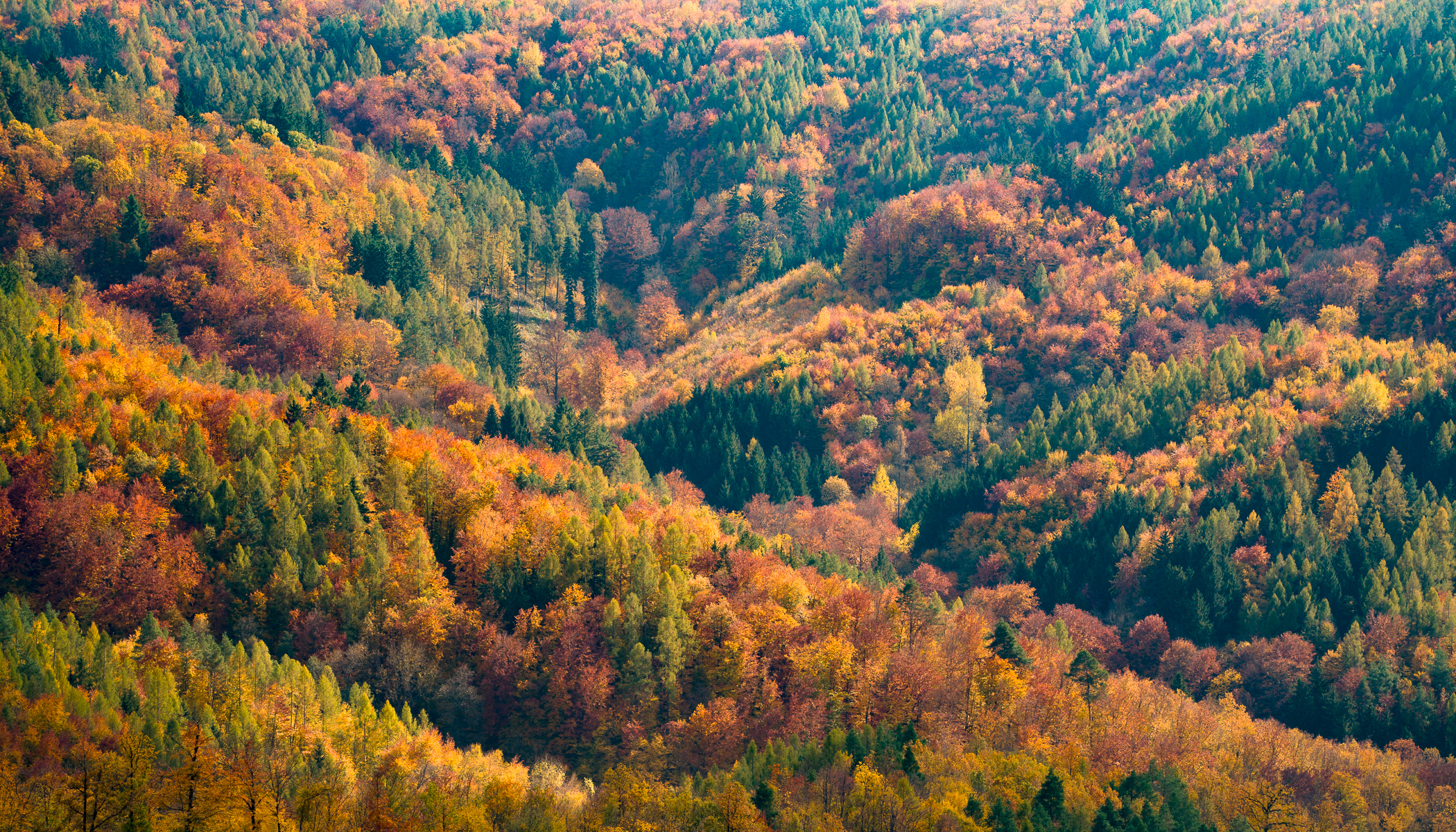 Views from above the forest are breathtaking, where clusters of trees of different hues alternate. The best destinations for photographers are hills with scenic views of the countryside or lookout towers.