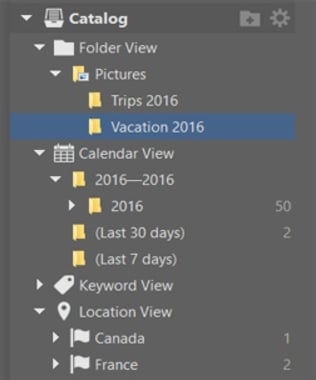 icon and pick the folder. You can browse the photos in cataloged photos by folder, but also by date, keywords, or location.