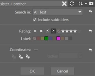 Let’s wrap up with an example of how tagging your photos make your work with them much easier. Say you’d like to delight your brother and sister with a photo book crafted from their photos. Start by writing keywords into the search box towards the top left. Write “sister+brother,” and the Catalog lists every photo you have that’s marked with these keywords. To narrow things down, also restrict the search to photos with a purple label (maybe you’re using it to mark your high-resolution photos!) and at least a 4 star rating. Now you don’t have to browse all day to prepare your book. See why sorting and labeling helps so much?