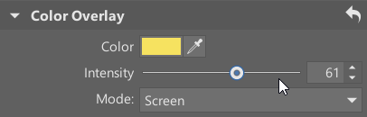 However, Temperature has its limits. For a more pronounced color shift, scroll down to the sliders in the Color Overlay section. Select a light yellow or orange, raise the Intensity, and experiment with different Modes. Instead of Normal, try Screen or Lighten.
