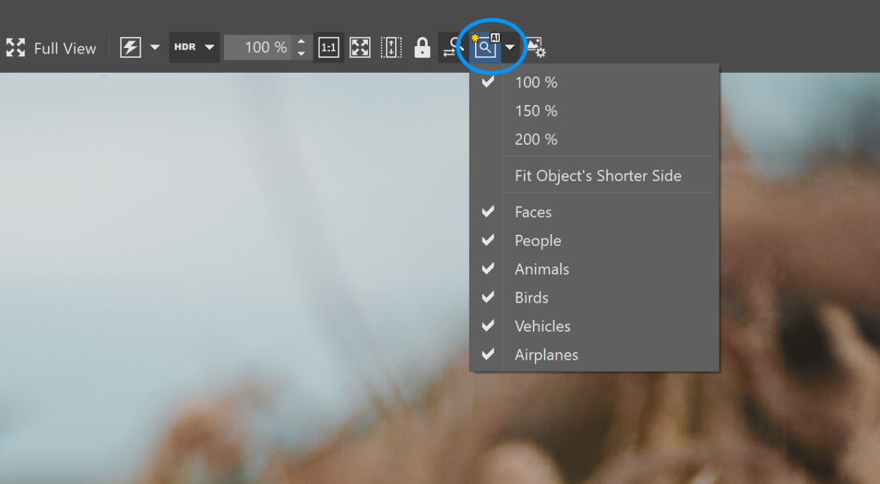 New AI Close-ups are available in the Manager module of Zoner Studio, right above image previews. Enable it by clicking the magnifying glass icon labeled AI.