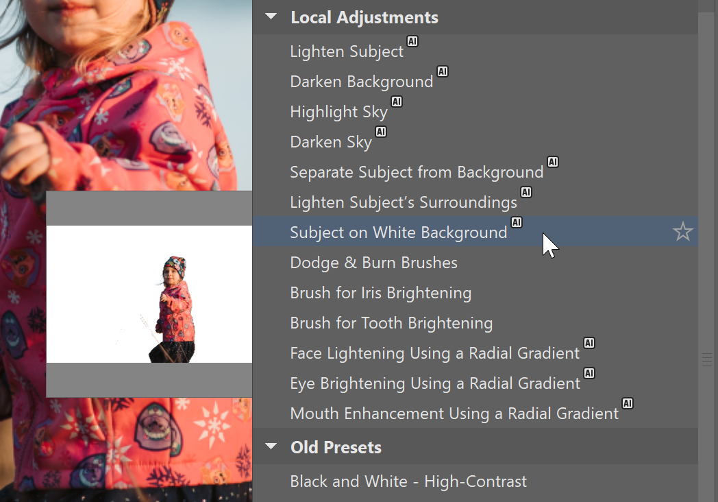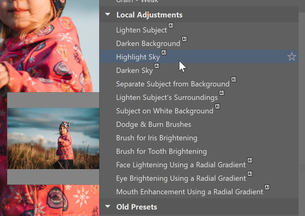 - AI Presets—Preset local adjustments (e.g. brighten the face, darken the sky)