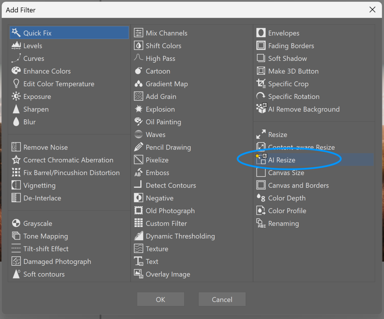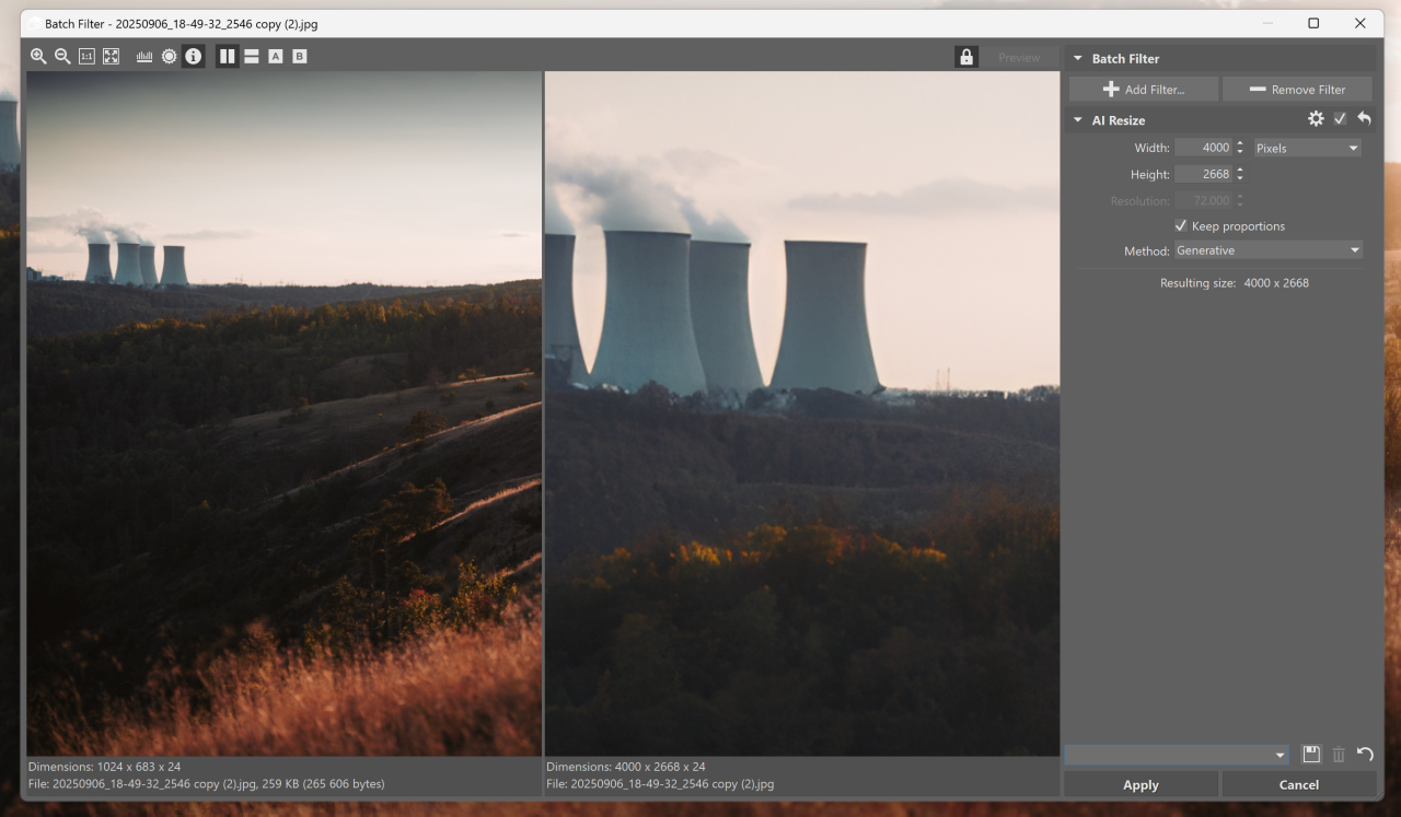 If you have a large number of photos that need to be enlarged, select them in the Manager, open Batch Filter, and add the AI Resize filter. Then set the desired dimensions and for Method, choose Generative.