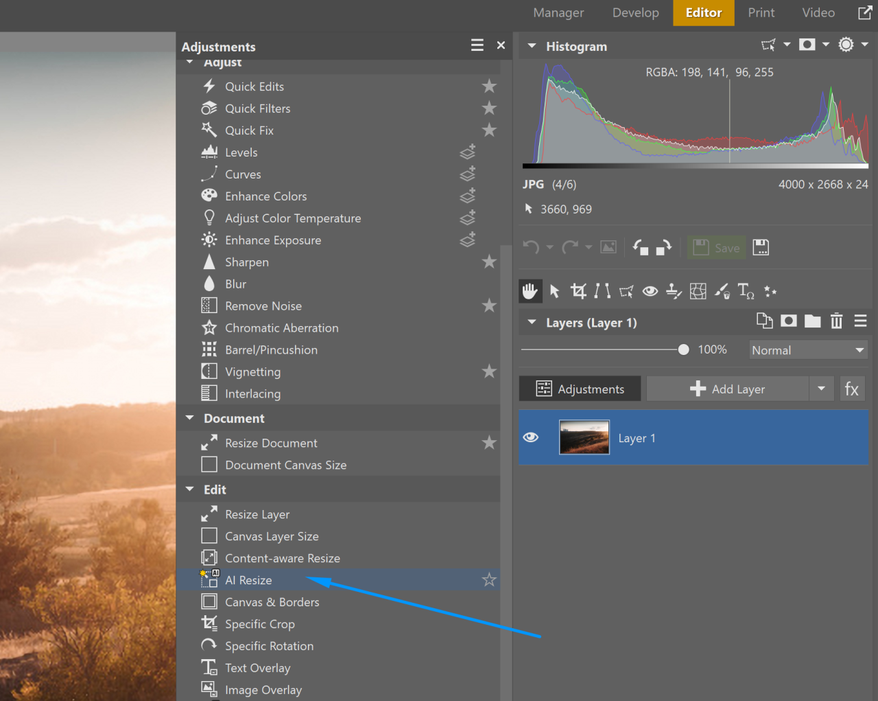 In the Editor, AI Resize can be found in the top menu under Edit or in the layers preview under the Adjustments button.