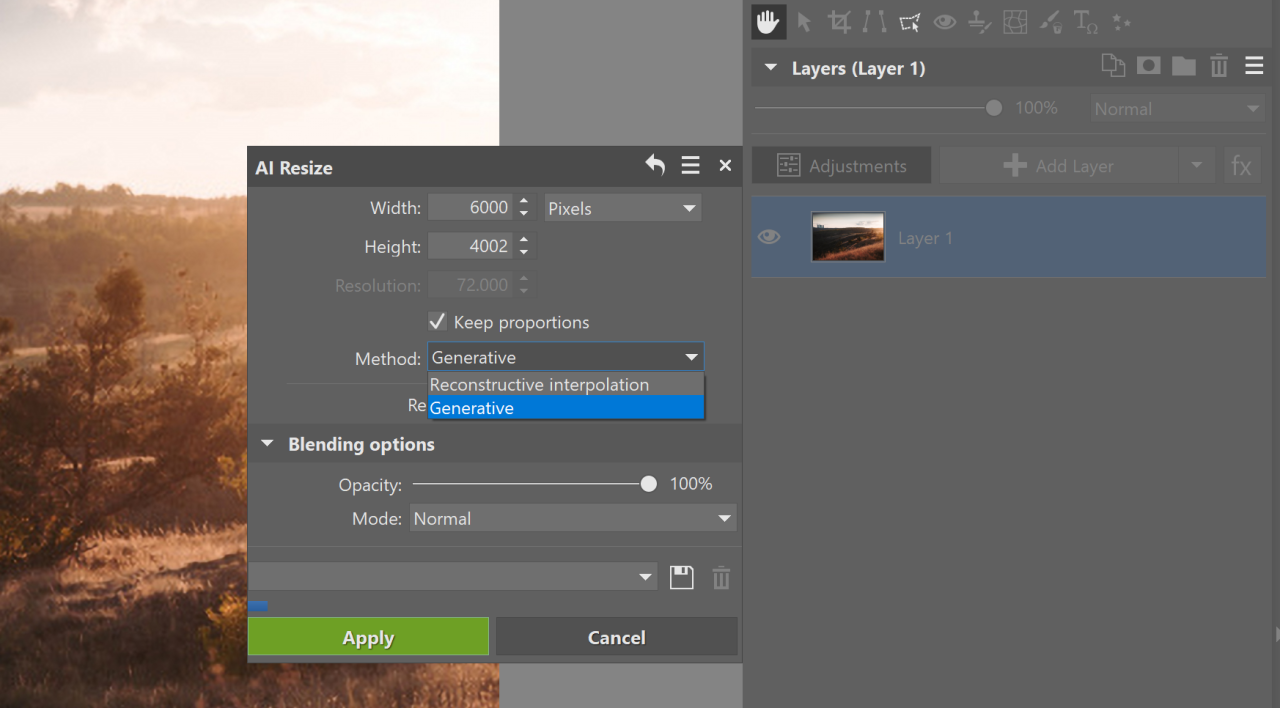 Try both methods on your own photos. You’ll clearly see how Reconstructive Interpolation significantly improves the photo. Generative resize can achieve even more, but sometimes introduces artificial details. This is a normal side effect of the method, not an error.