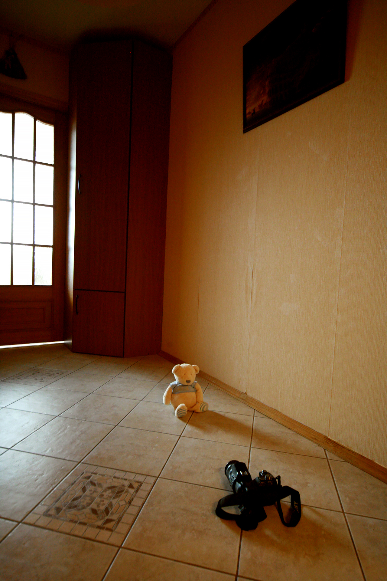 Here’s the lighting situation: a dark hallway with a dim bluish light on one side and a dim yellow light on the other. If we shot without flash, we’d have to raise the ISO. And as we all know, this means more digital noise. There’s also the issue of mixed color temperatures, which can be interesting, but isn’t what we want in this case.