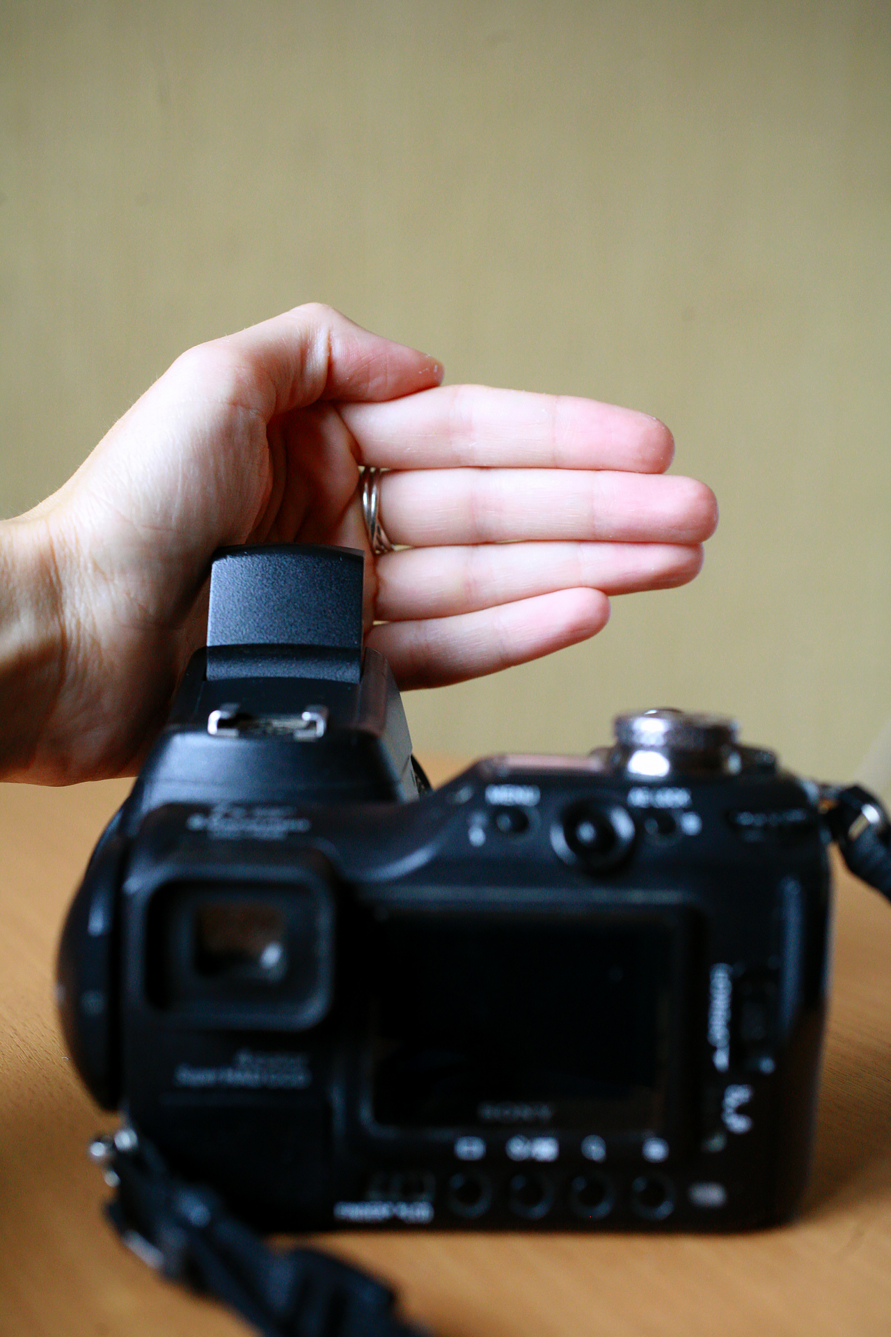 Before the glue dries, bend the corners—more on one side, less on the other. Place the card over the flash with the more bent side aiming the light beam toward the wall.