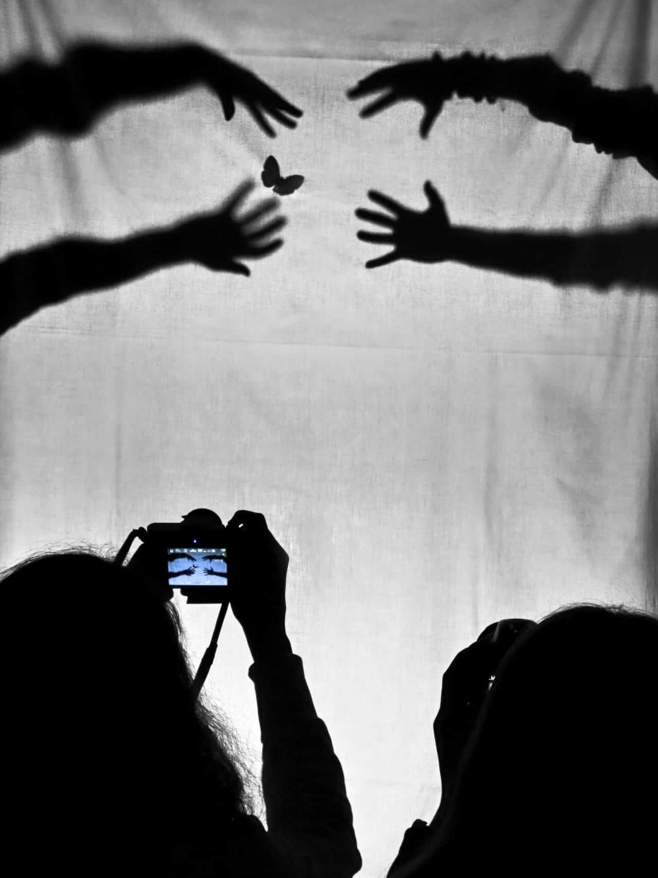 If you want to get playful, try making your own shadow theater. All you need is a piece of white paper or white sheet, a strong lamp, and a few figures made using your own hands. Place the lamp so that it shines from behind, and position the props between the light and the “screen.” You can photograph the silhouette of a bug that looks straight out of a horror movie, animal shapes made with your hands, or dramatic shadows of everyday objects. Always shoot from the front, towards the screen, and see how the composition changes as you move the light or the props.