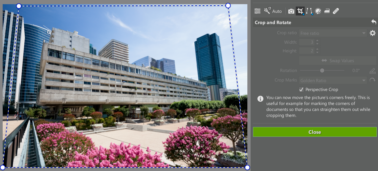 When should I use Perspective Crop? It’s most useful for architecture photos where vertical lines appear to converge.
