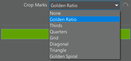 Crop Marks add guide lines to help you compose your image more precisely. The most commonly used are Golden Ratio and Thirds.