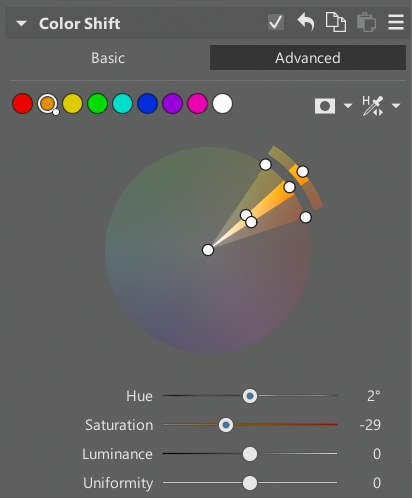 Now we’re getting into more precise color adjustments, where the Color Shift tool—specifically the Advanced tab—comes in handy. This allows you to easily target a specific problematic color in the image and change its tint.