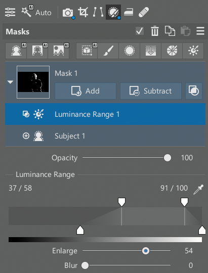 Masks make this possible. I start with the Subject AI Mask. Then I add a Luminance Range AI Mask using the Add button. I limit it to brighter tones only. Then, I adjust the colors using White Balance or Split Toning. The adjustment applies only to the bright areas of the subject.