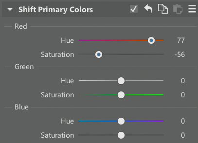 Shift Primary Colors in the right panel of Develop offers a slightly different approach. It allows for additional global color adjustments beyond White Balance, especially the ability to increase or decrease the saturation of individual color channels.