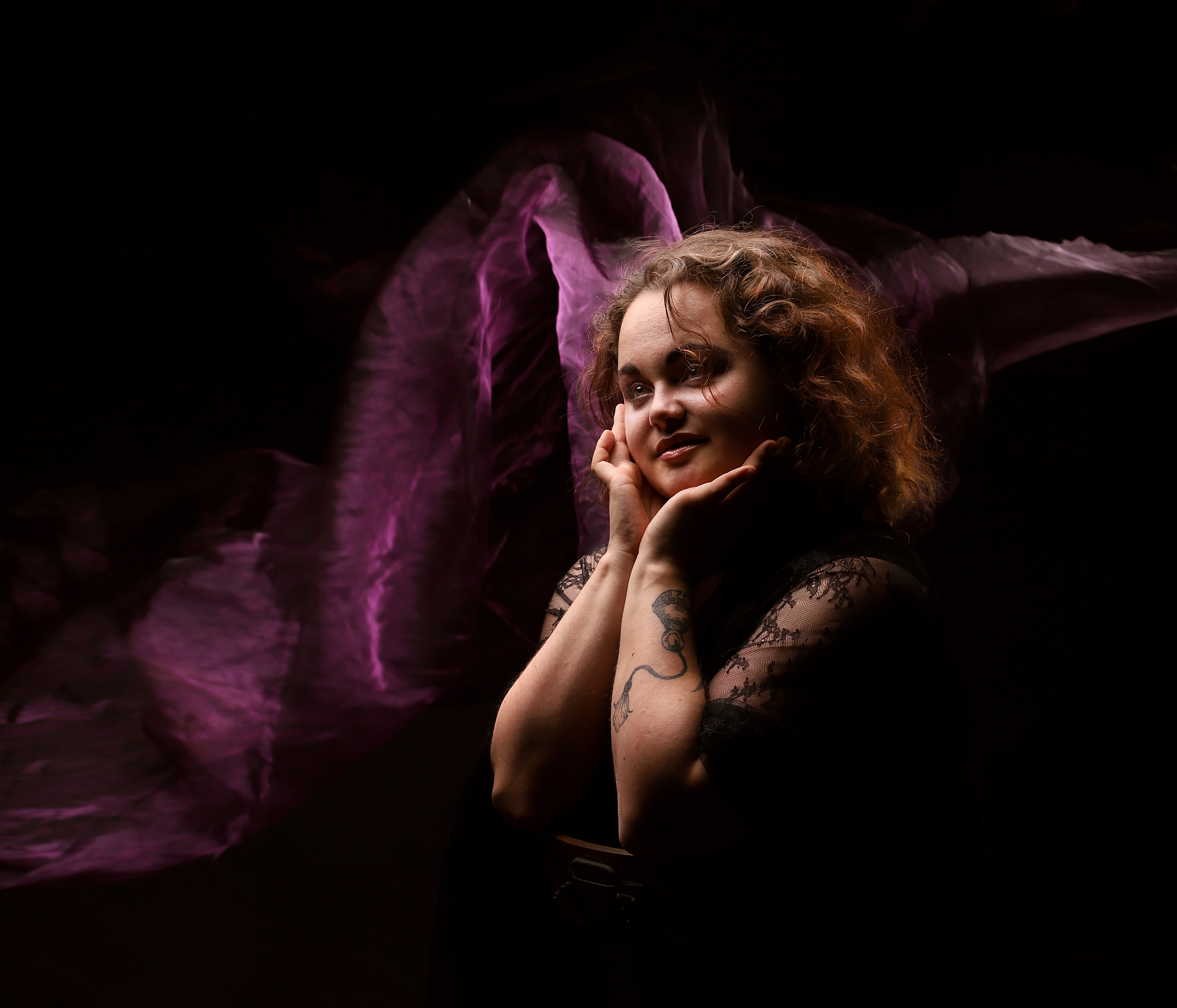 Motion can dramatically change the feel of a portrait. For example, flowing fabric in the background can add energy and direction. If you have an assistant who can help, it’s worth trying. Lightweight fabrics like organza work best.