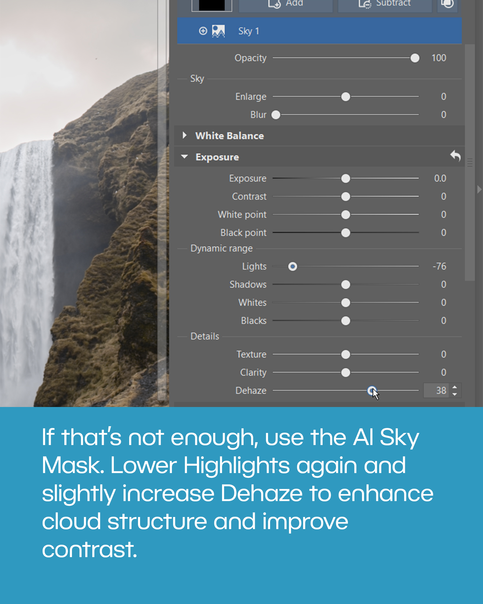 Within the sky mask, lower the Highlights again and slightly increase Dehaze. This enhances cloud structure and improves contrast in the sky. The adjustment will be more pronounced while still looking natural, because it only affects the sky.