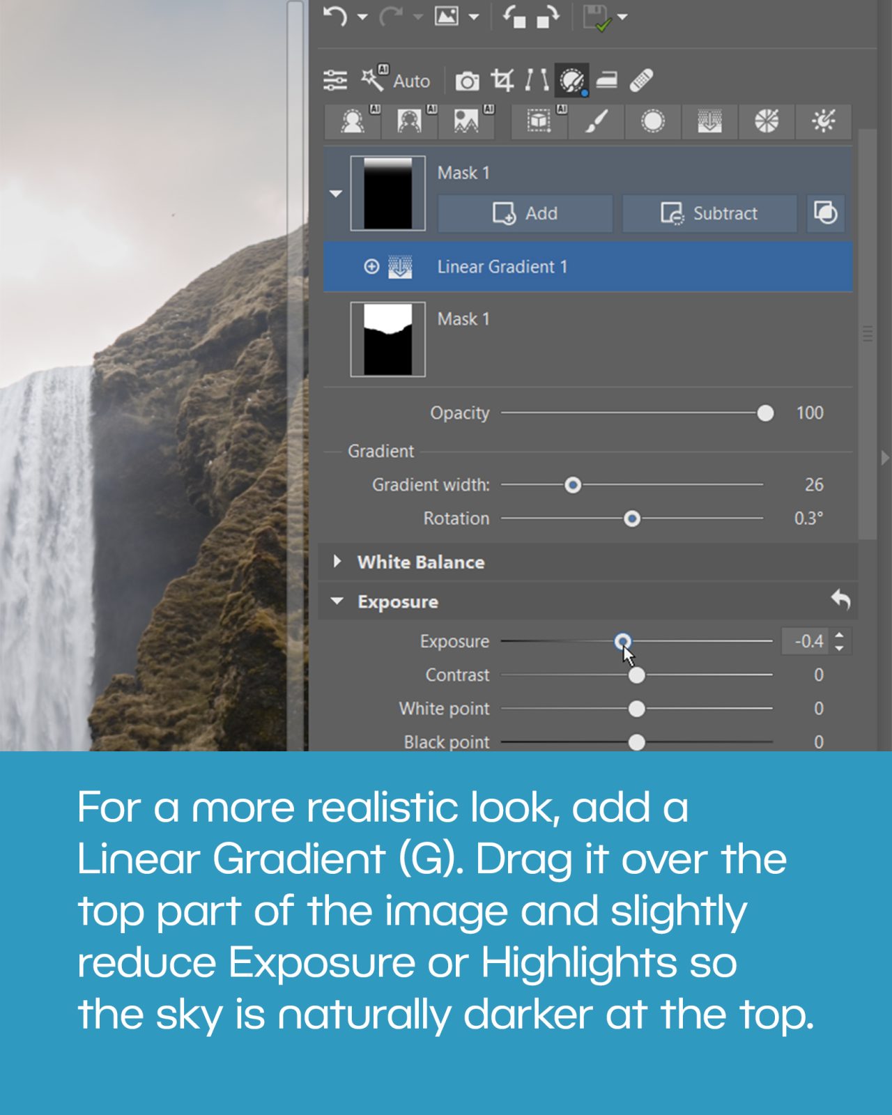 Drag the gradient over the top part of the photo and slightly reduce Exposure or Highlights. This creates a more natural transition between the sky and the landscape, making the image look more realistic.