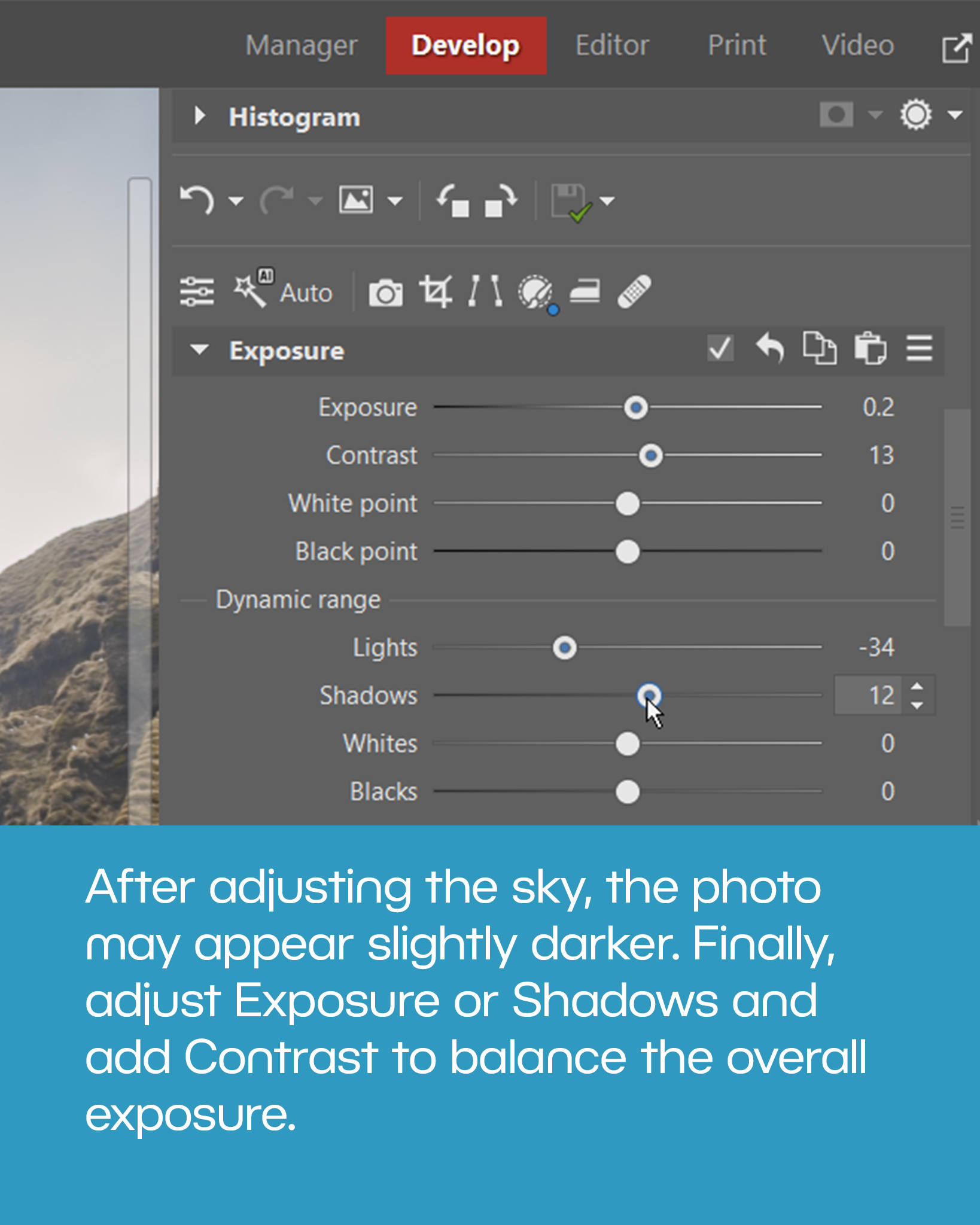After adjusting the sky, the rest of the photo may appear too dark. In that case, slightly adjust Exposure or Shadows to brighten the image. Adding a bit of Contrast can also help.