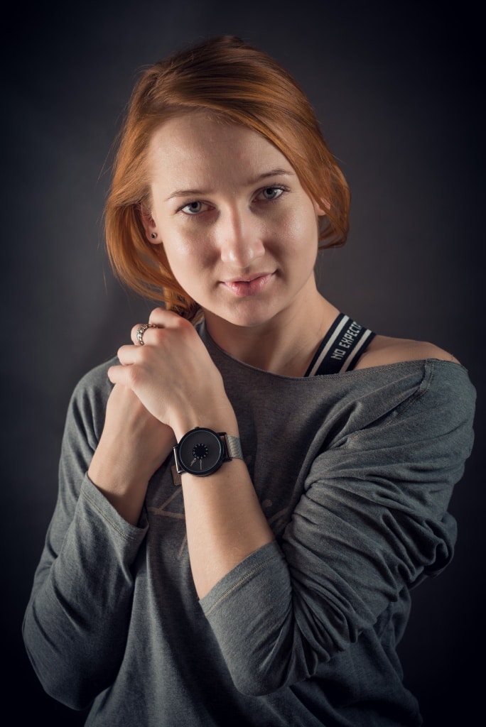 You can try out face retouching on the studio portrait below. The shot was lighted using two softboxes at almost 90° on both sides. So instead of soft, smoothing light, it’s dramatic and high-contrast. That makes the skin defects all the more visible. And that in turn will give you several problem groups to try and fix.
