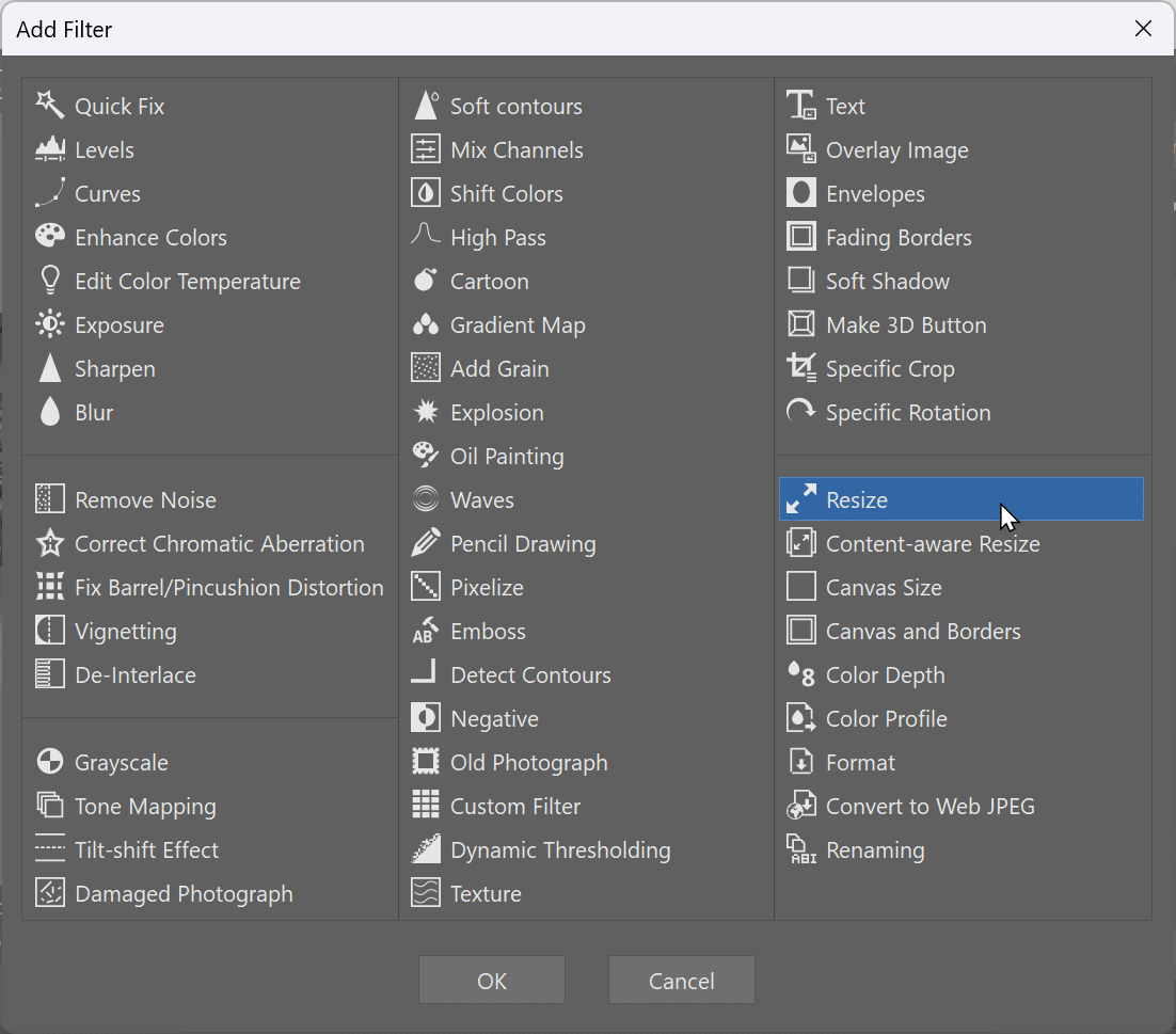 If you have a whole series of photos that you want to resize at the same time, use the Batch Filter feature (Ctrl+Q). You’ll find it in the Manager’s right panel.