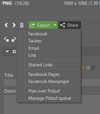 To start your batch photo sharing, just click on Share -> Plan over Pixbuf. Your picture is then uploaded to Pixbuf, and from there you can share it to selected social networks.