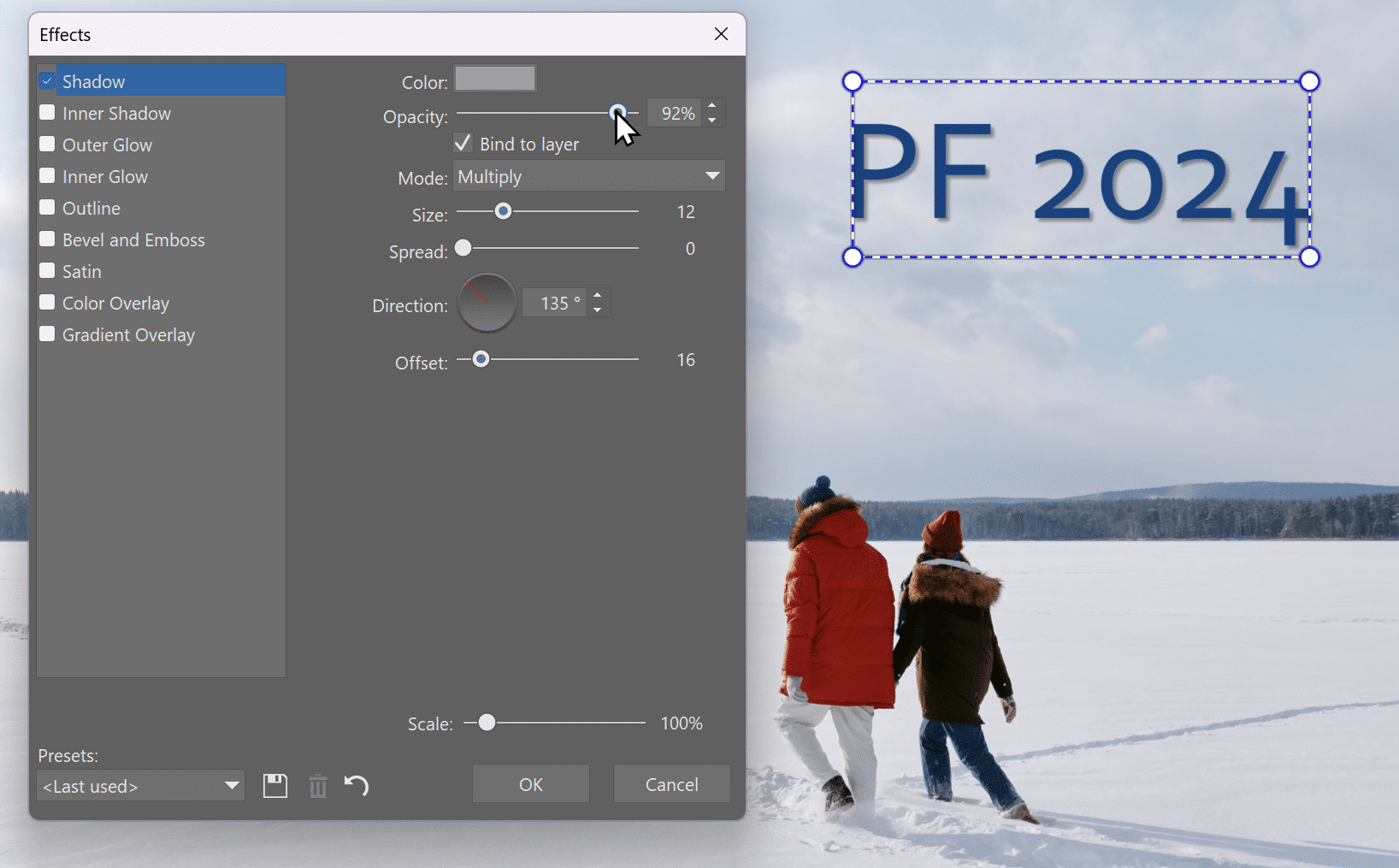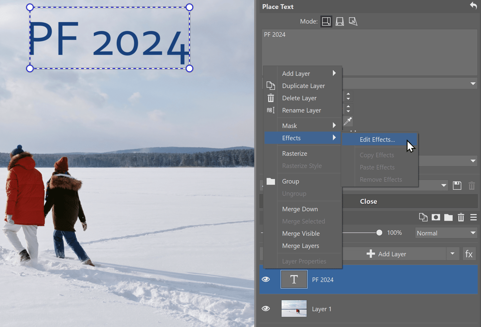 To make your greeting easy to read, give the text a nicely contrasting color that won’t blend into the photo. Just right-click on the layer and use Effects > Edit Effects.