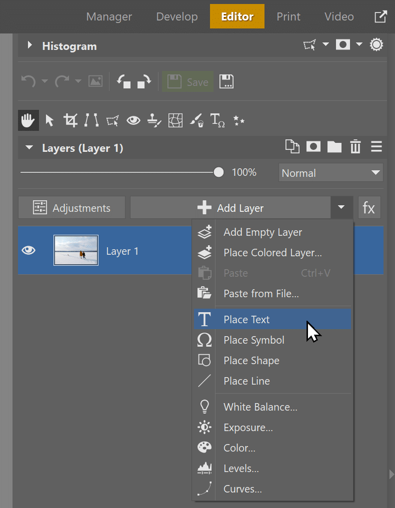 Once you’ve opened the photo in the Editor, click +Add Layer and then +Add Text. A separate layer with a text box is created automatically. You can go back to it to edit it some more at any time—just click on it in the Layers controls.