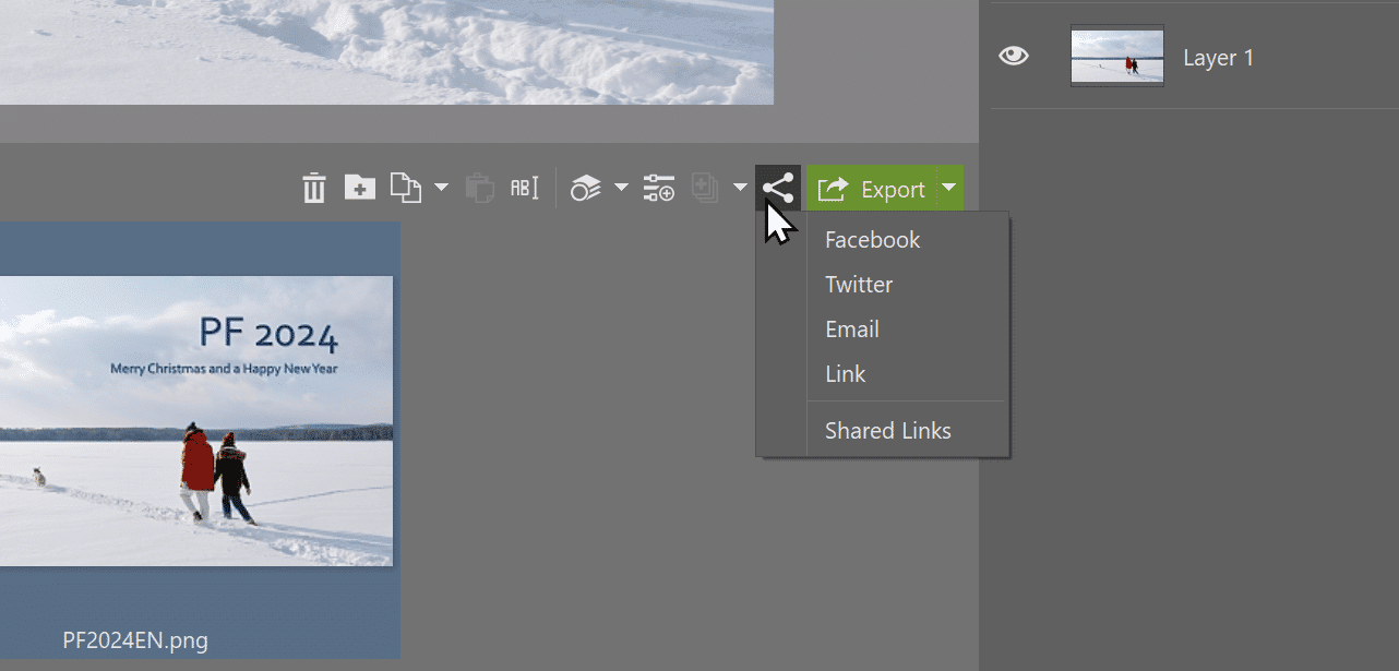 To quickly and easily send out your finished greeting right from Zoner Studio, click the Share button. You can choose from among several options here, ranging from classical sending over email to sharing on Facebook or X (Twitter).